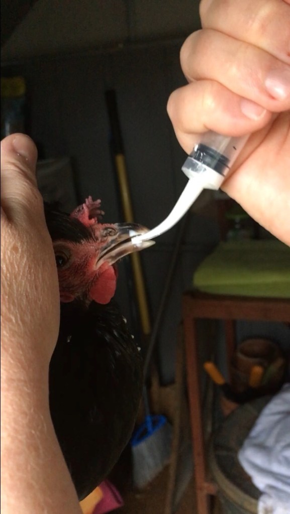 Treating worms in a bantam cochin hen with SafeGuard.
